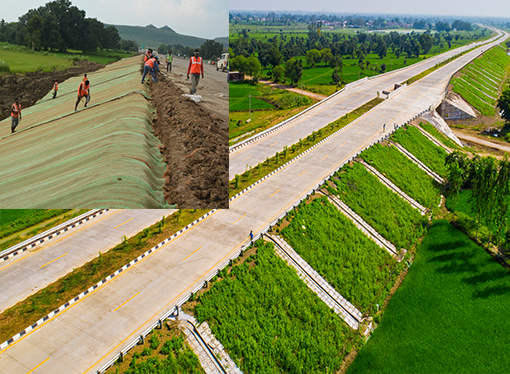 Geo Green is an initiative taken by DBL for environmental sustainability and to protect the soil from either side of under construction roads from eroding. The road construction process displaces a lot of soil and loosens earth, impacting the quality of land in the surroundings. To prevent this from happening, DBL plants trees and grows grass on dividers, beautifying the roads in the process.